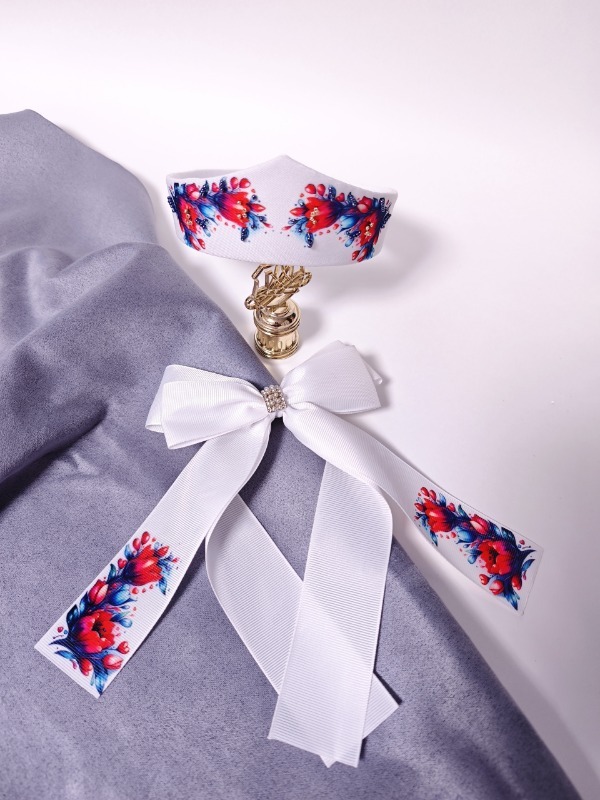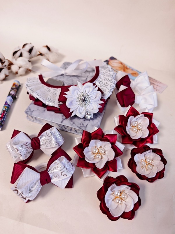 Основной линейкой мастерицы стали школьные аксессуары, которые не теряют актуальности. Они изготовлены под цвет формы, будь она синей, серой или бордовой. Для парадной формы Юлия придумывает белые аксессуары.
