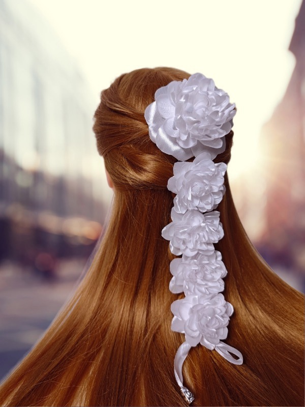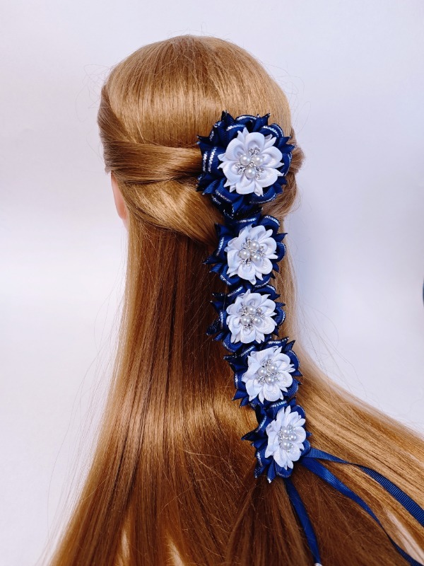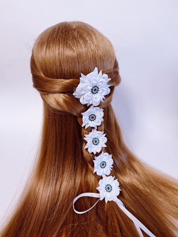 — Есть ещё очень интересное украшение, называется «лента в косу». Это моя визитная карточка, по которой меня узнают даже в других городах. Ничего сложного, плетётся, как простая коса. А эффект «вау» обеспечен! Они тоже представлены у меня в разных вариантах и цветах, — отмечает мастерица.