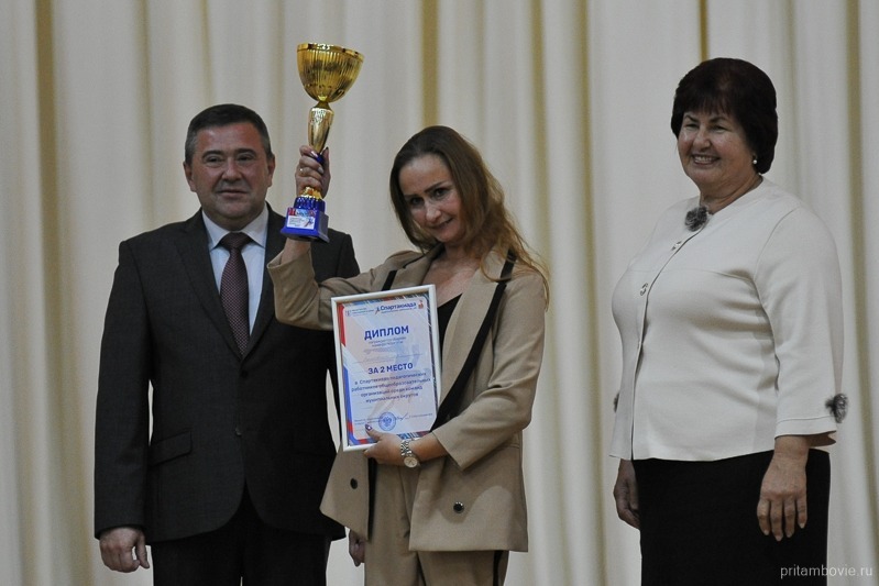 Диплом и кубок сборной команды педагогов Притамбовья за второе место в Спартакиаде среди педагогических команд из муниципалитетов области вручили участнику команды, учителю физической культуры Анастасии Гусевой.