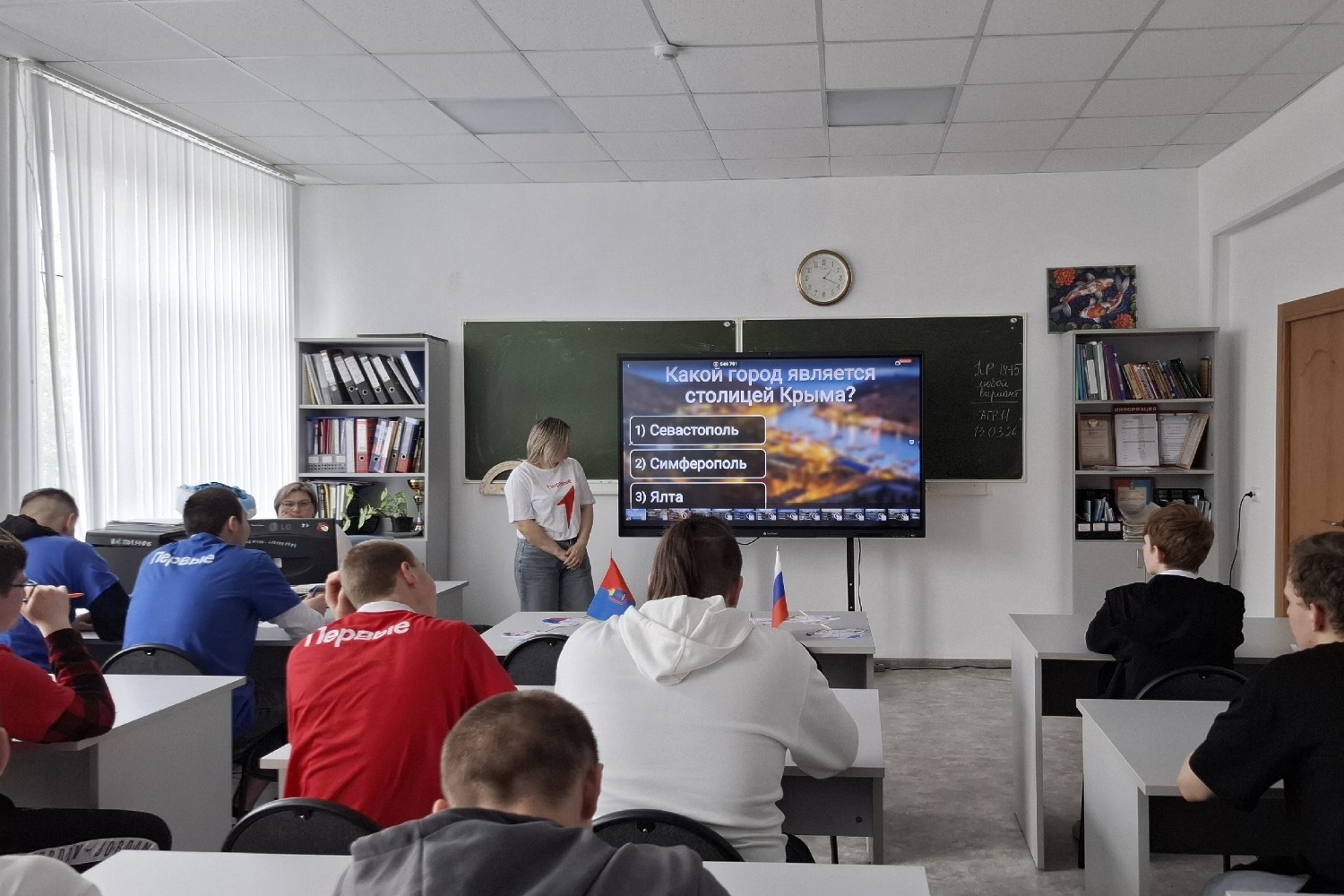Накануне памятной даты — Дня воссоединения Крыма и Севастополя с Россией — в Аграрно-технологическом техникуме в поселке совхоза «Селезневский» провели исторический квиз. Советник директора по воспитанию Вероника Графская и педагог-организатор Анастасия Никонова напомнили ребятам события «Крымской весны» 2014 года.